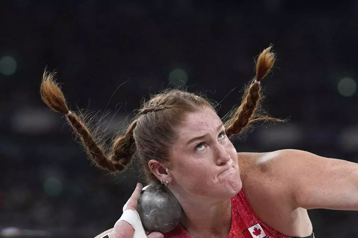 Canada's Sarah Mitton makes an attempt in the women's shot put final at the World Athletics Championships in Tokyo, Saturday, Sept. 20, 2025. (AP Photo/Matthias Schrader)