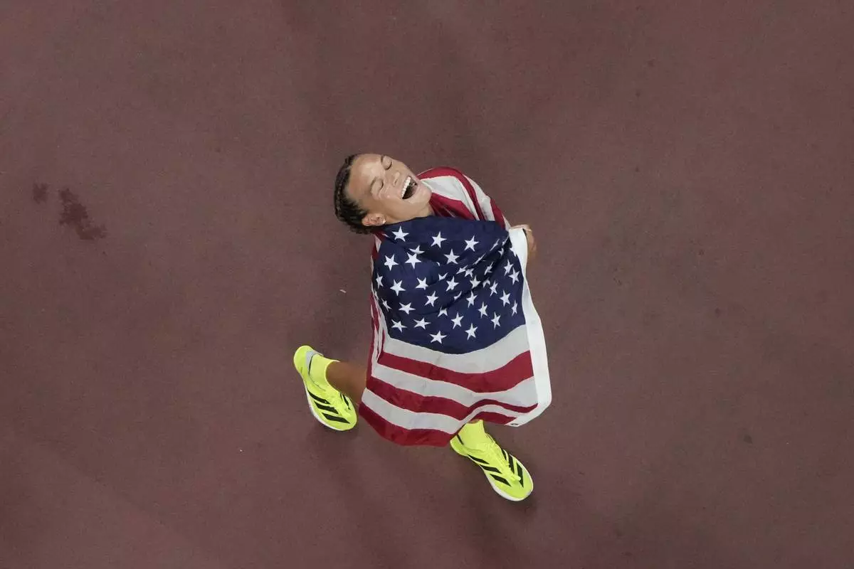 United States' Anna Hall celebrates after winning the heptathlon at the World Athletics Championships in Tokyo, Saturday, Sept. 20, 2025. (AP Photo/David J. Phillip)
