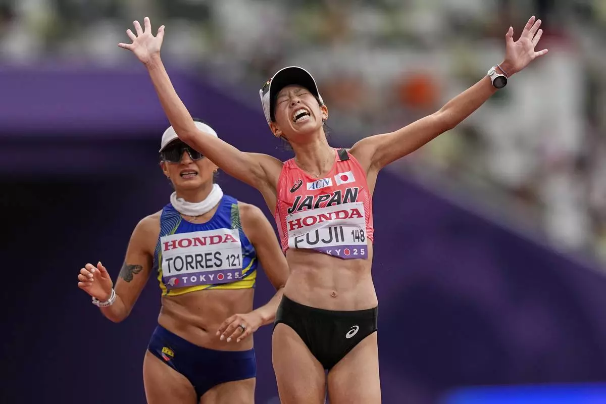 Japan's Nanako Fujii beats Ecuador's Paula Milena Torres to the bronze medal in the women's 20 kilometers race walk at the World Athletics Championships in Tokyo, Saturday, Sept. 20, 2025. (AP Photo/Petr David Josek)