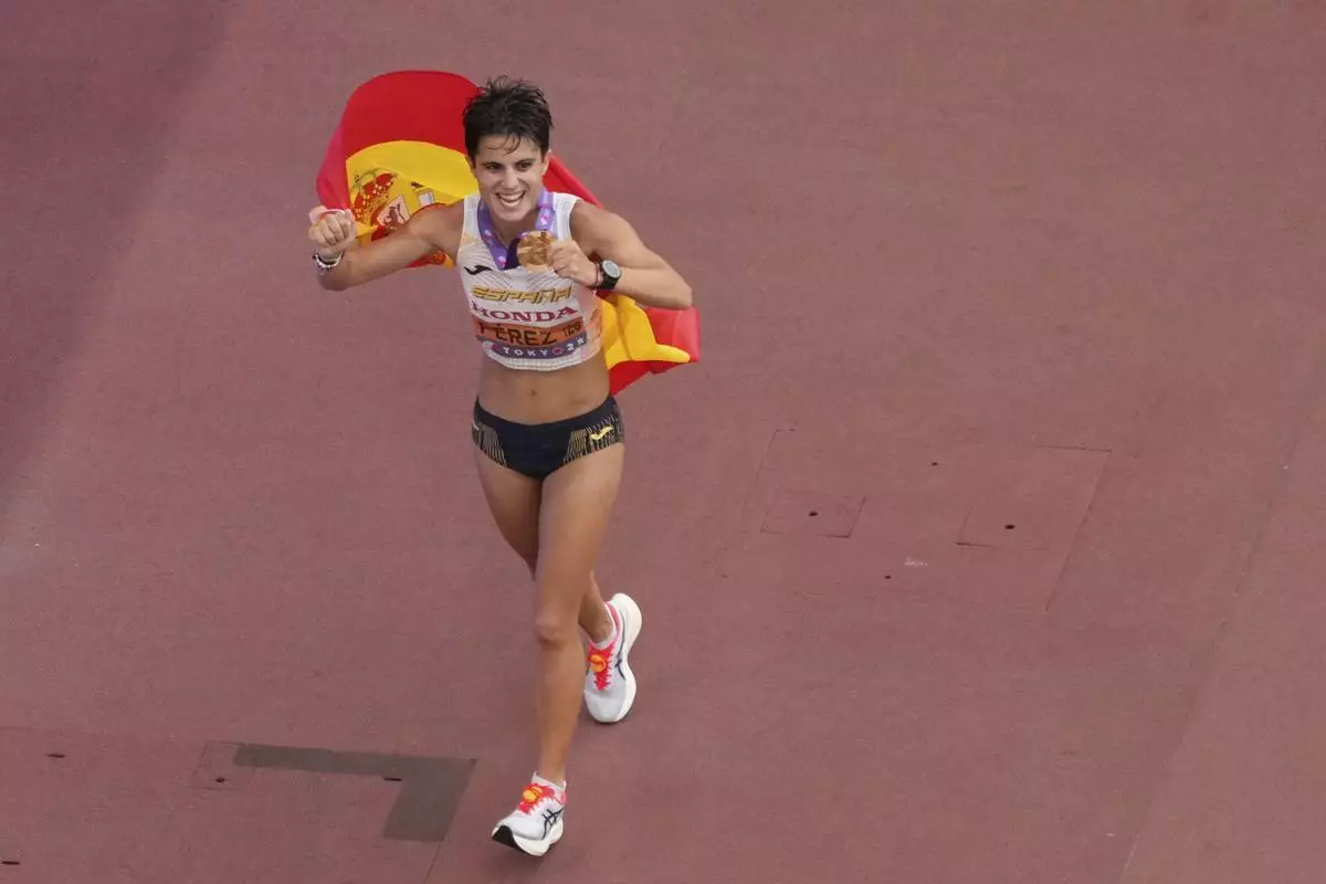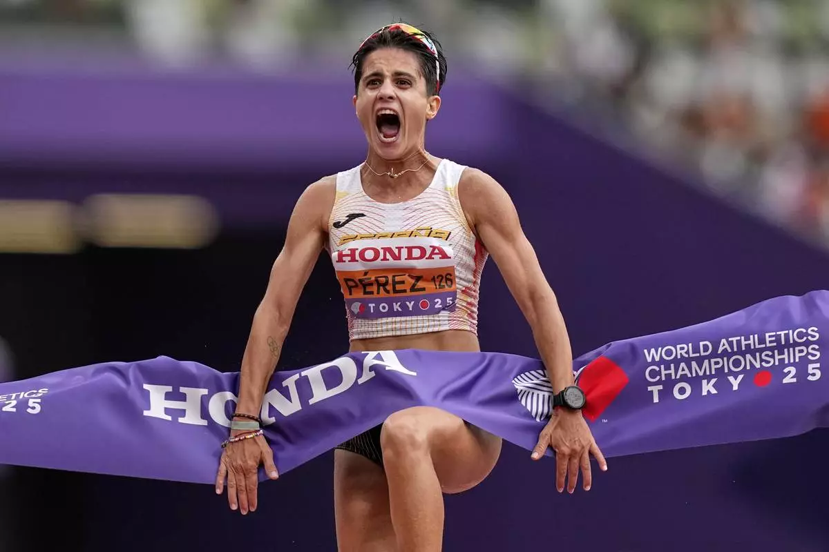 Spain's Maria Perez celebrates after winning the gold medal in the women's 20 kilometers race walk at the World Athletics Championships in Tokyo, Saturday, Sept. 20, 2025. (AP Photo/Petr David Josek)