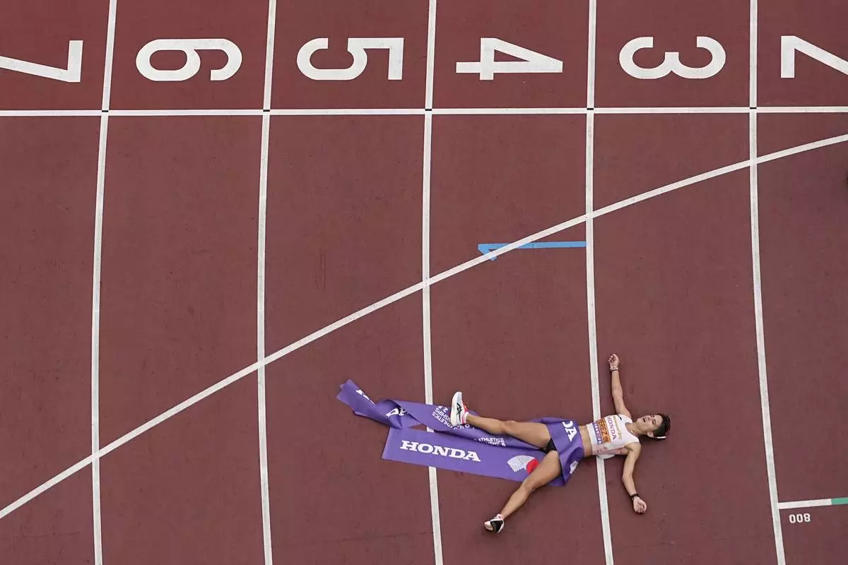 Spain's Maria Perez lays on the track after winning the women's 20 kilometers race walk at the World Athletics Championships in Tokyo, Saturday, Sept. 20, 2025. (AP Photo/Bernat Armangue)