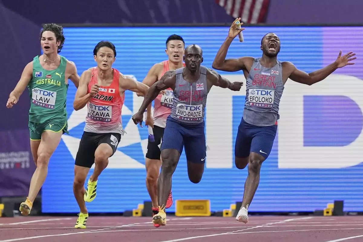 Britain's Jona Efoloko reacts as he fails to hand the baton in time to Britain's Eugene Amo-Dadzie in a men's 4 X 100 meters relay heat at the World Athletics Championships in Tokyo, Saturday, Sept. 20, 2025. (AP Photo/Petr David Josek)