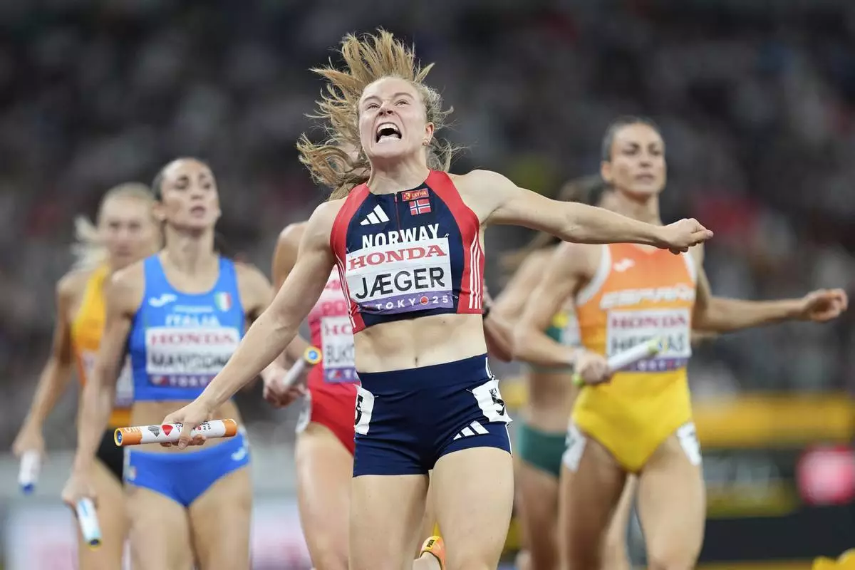 Norway's Henriette Jaeger reacts after finishing a women's 4 X 400 meters relay heat at the World Athletics Championships in Tokyo, Saturday, Sept. 20, 2025. (AP Photo/Petr David Josek)