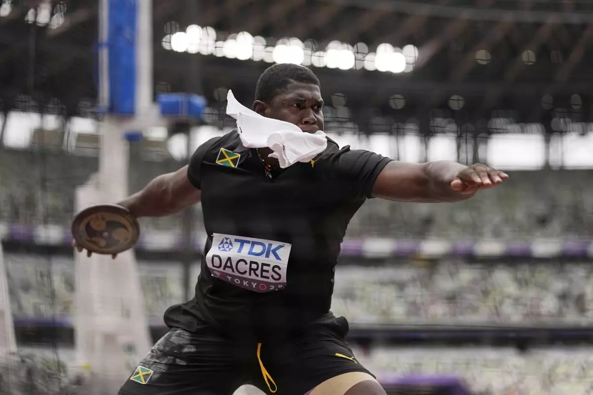 Jamaica's Fedrick Dacres makes an attempt in the men's discus throw qualification at the World Athletics Championships in Tokyo, Saturday, Sept. 20, 2025. (AP Photo/Matthias Schrader)