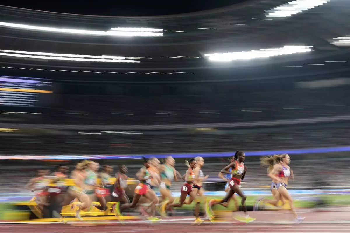 Athletes compete in the the women's 5,000 meters final at the World Athletics Championships in Tokyo, Saturday, Sept. 20, 2025. (AP Photo/Petr David Josek)