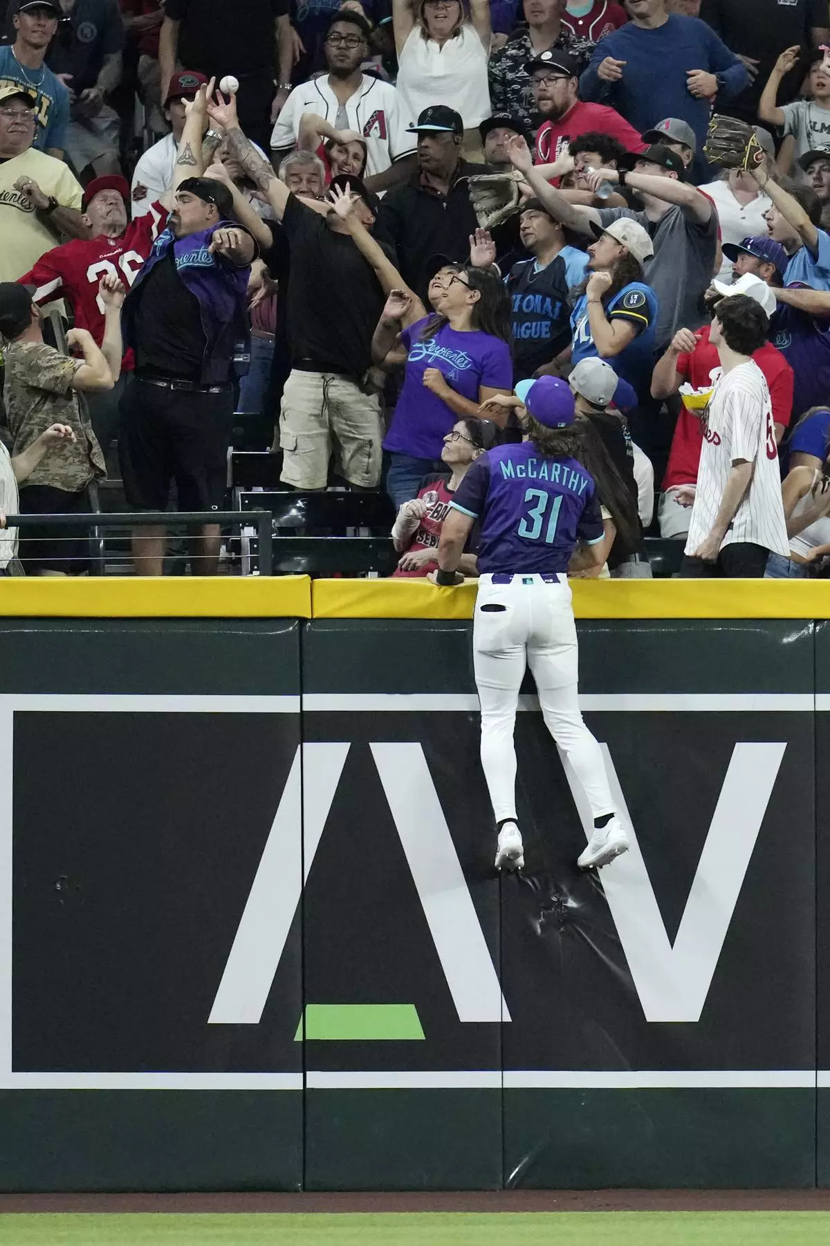 Arizona Diamondbacks left fielder Jake McCarthy leaps in vain for a home run hit by Philadelphia Phillies' Harrison Bader during the fifth inning of a baseball game Friday, Sept. 19, 2025, in Phoenix. (AP Photo/Ross D. Franklin)