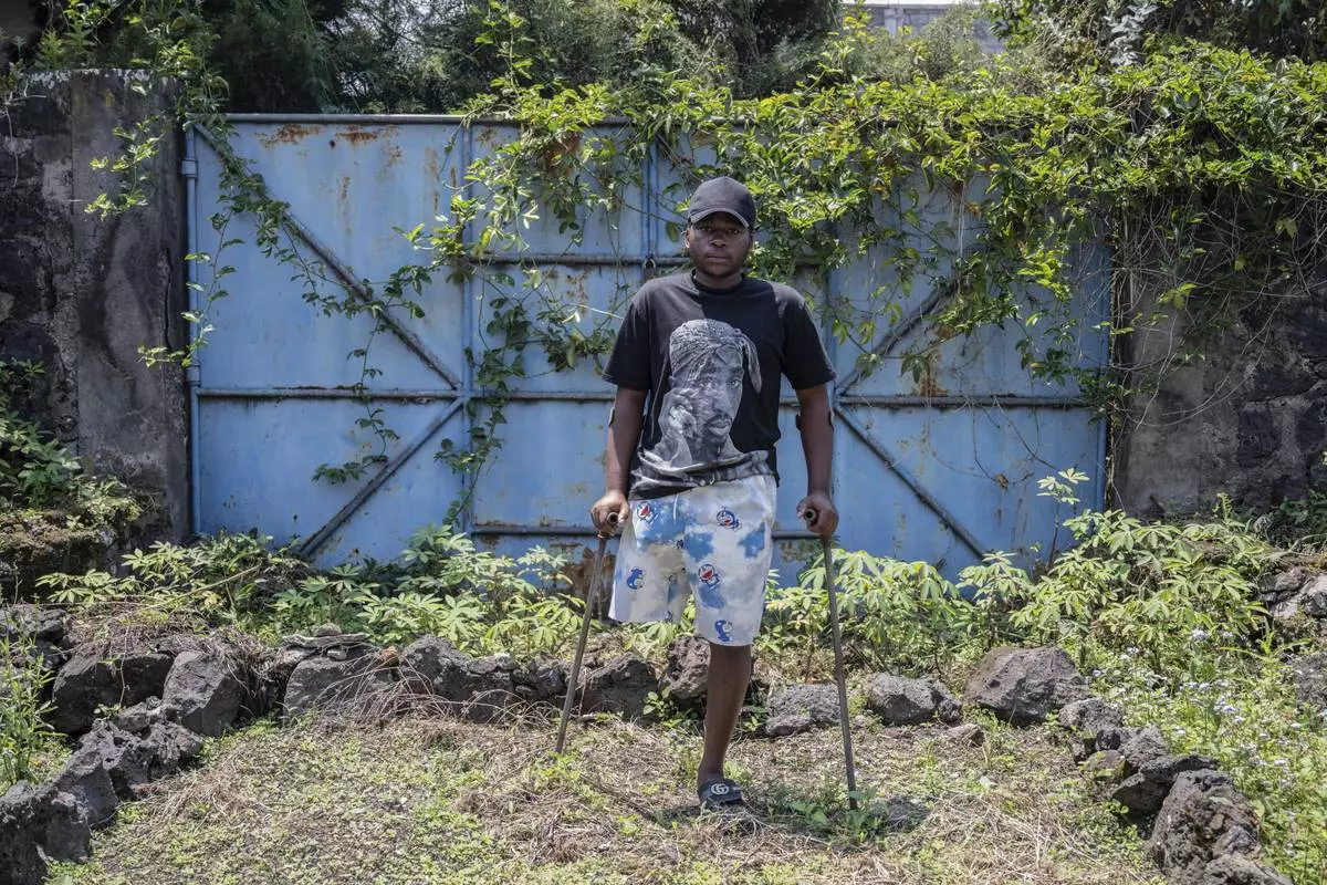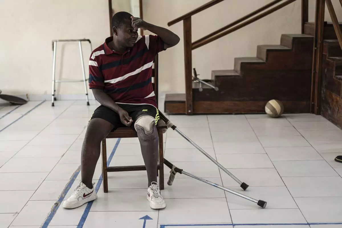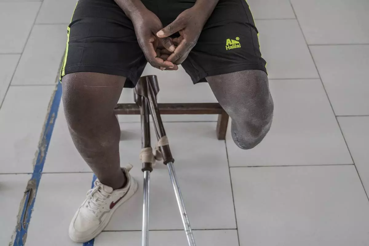 Faustin Amani, 20, sits silently on a wooden bench at the clinic, his gaze fixed on the courtyard. His right leg, amputated above the knee, is neatly bandaged. Yet the pain seems to extend beyond the physical wound.