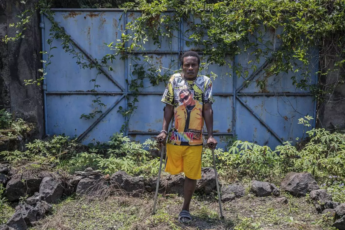 Jerome Jean-Claude Amani, one of many wounded by fighting in the region, poses for a photo at an orthopedic center run by the Catholic church and supported by Red Cross in Goma, eastern Congo, Friday, Aug. 29, 2025. (AP Photo/Moses Sawasawa)