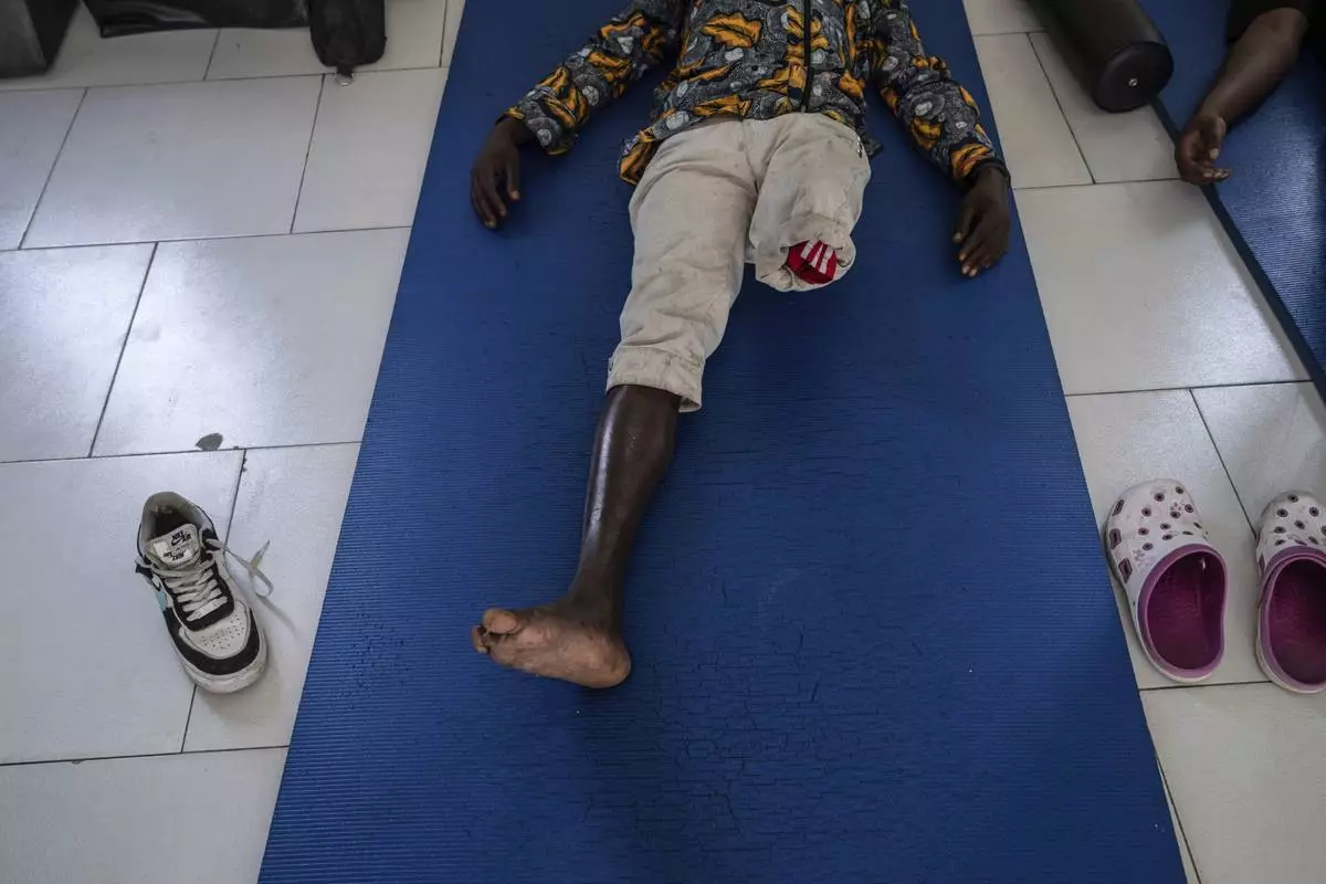 A victim of fighting in the region, waits for physiotherapy at an orthopedic center run by the Catholic church and supported by Red Cross in Goma, eastern Congo, Friday, Aug. 29, 2025. (AP Photo/Moses Sawasawa)