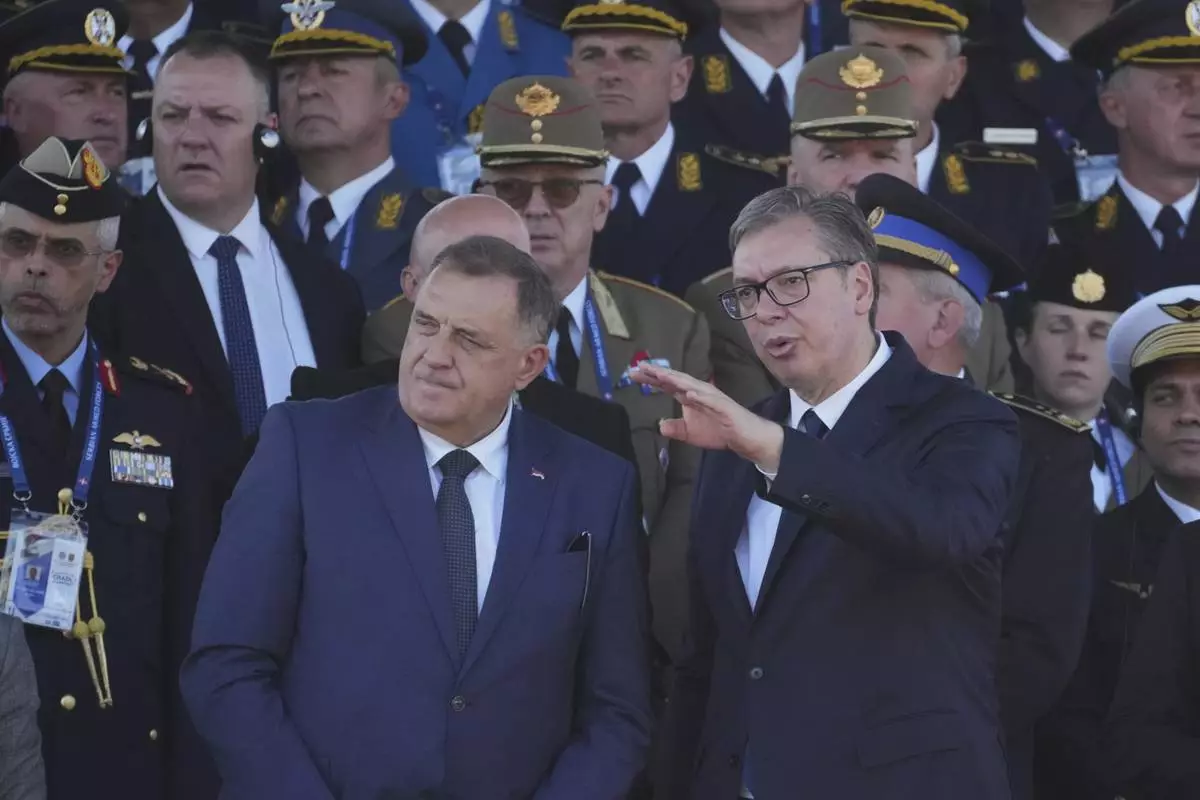 Serbian President Aleksandar Vucic and Bosnian Serb leader Milorad Dodik attend a military parade in Belgrade, Serbia, Saturday, Sept. 20, 2025. (AP Photo/Darko Vojinovic)