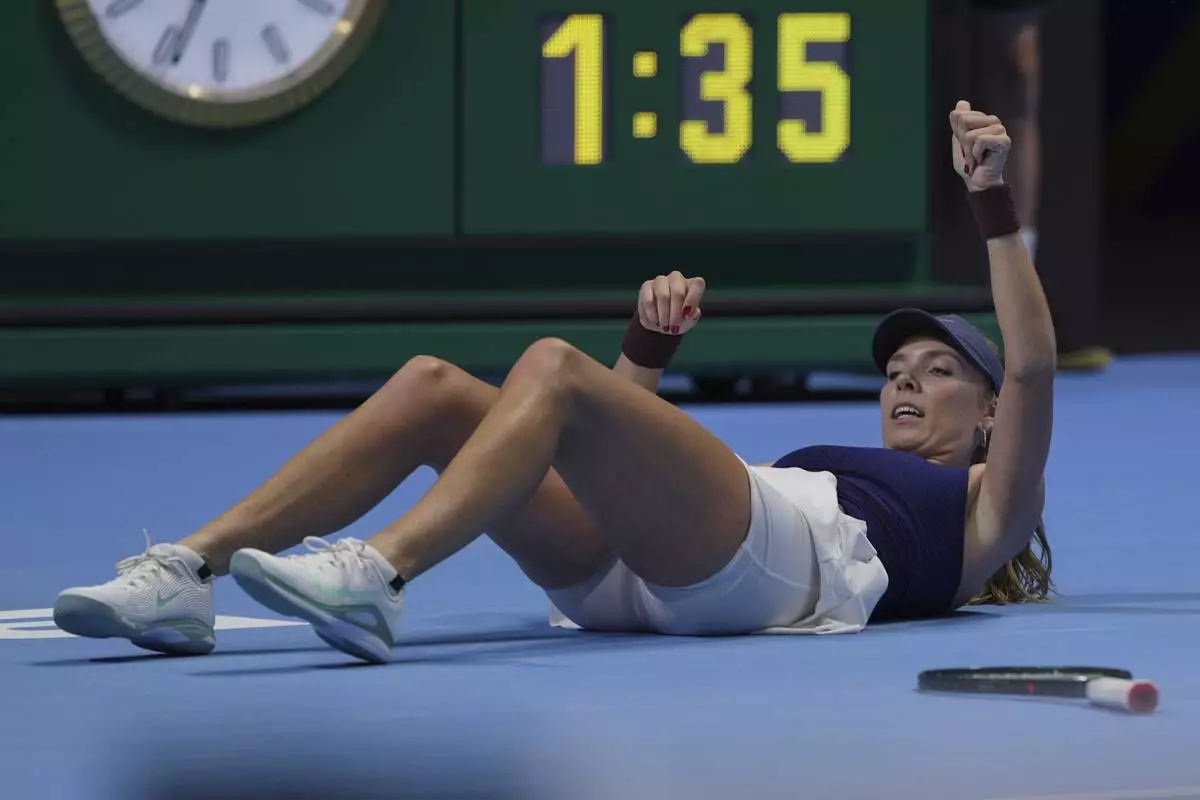 Katie Boulter, of Britain fell on court during the Billie Jean King Cup semifinals tennis match against Jessica Pegula, of the United States, at the Shenzhen Bay Sports Center Arena, in Shenzhen, China's Guangdong province, Saturday, Sept. 20, 2025. (AP Photo/Andy Wong)