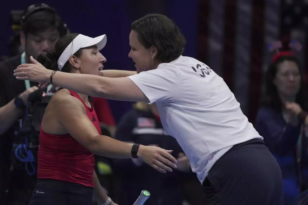 Jessica Pegula, of the United States celebrates with her team captain Lindsay Davenport after winning in the Billie Jean King Cup semifinals tennis match against defeating Katie Boulter, of Britain, at the Shenzhen Bay Sports Center Arena, in Shenzhen, China's Guangdong province, Saturday, Sept. 20, 2025. (AP Photo/Andy Wong)