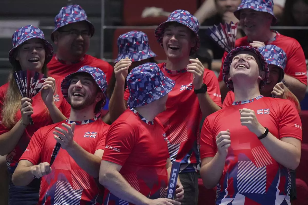 British fans cheer during the Billie Jean King Cup semifinals tennis match between Sonay Kartal, of Britain and Emma Navarro, of the United States, at the Shenzhen Bay Sports Center Arena, in Shenzhen, China's Guangdong province, Saturday, Sept. 20, 2025. (AP Photo/Andy Wong)