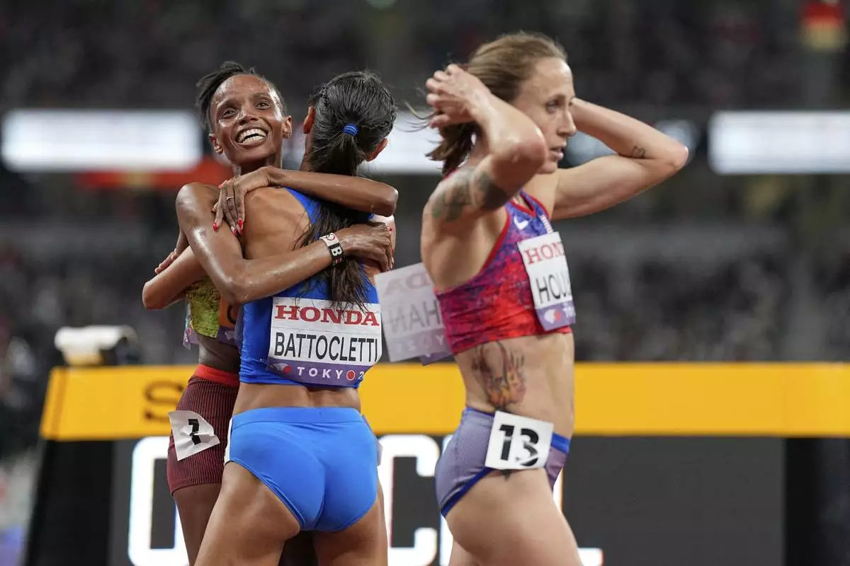 Italy's Nadia Battocletti, bronze, Kenya's Beatrice Chebet, gold, embrace as United States' Shelby Houlihan walks past after the women's 5,000 meters final at the World Athletics Championships in Tokyo, Saturday, Sept. 20, 2025. (AP Photo/Petr David Josek)