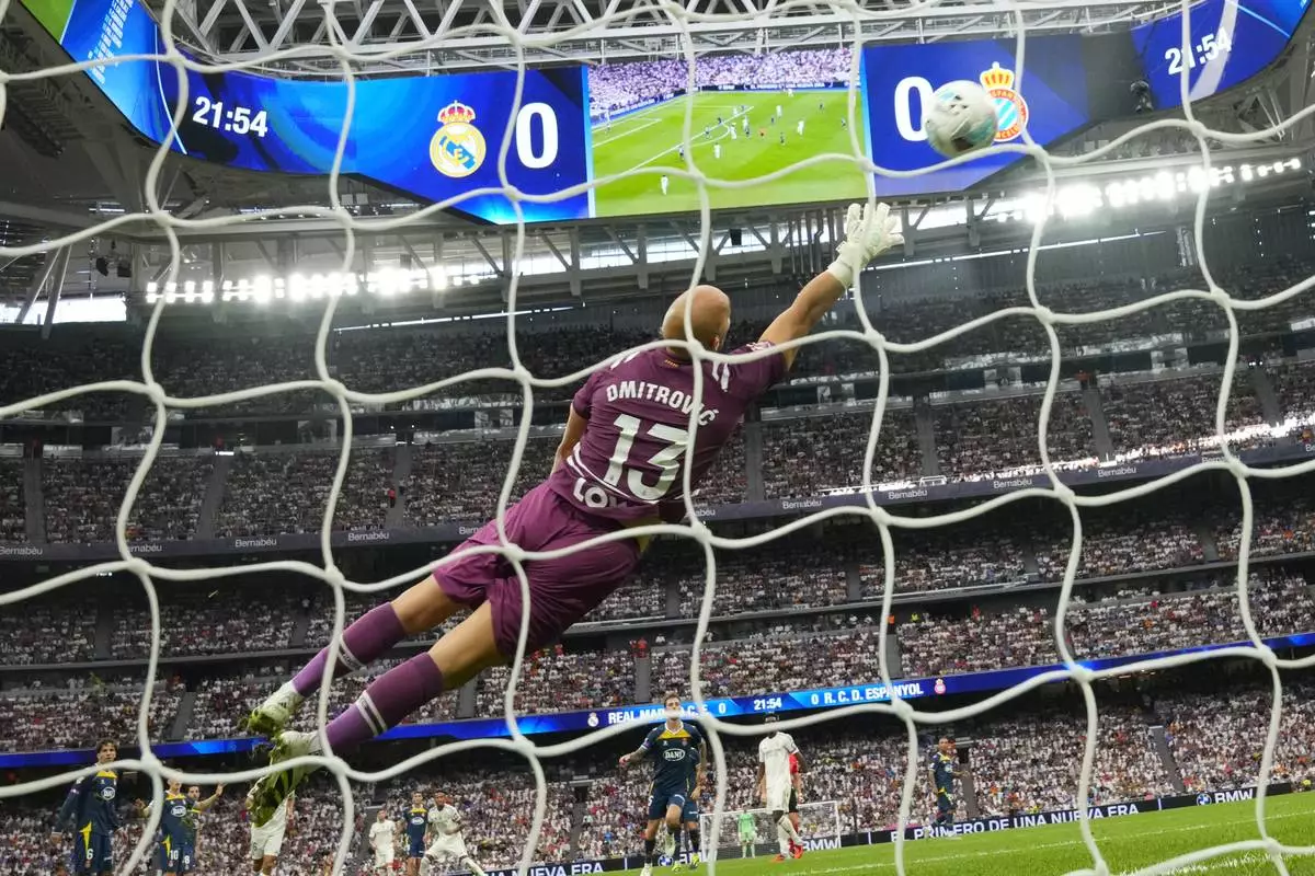 Espanyol's goalkeeper Marko Dmitrovic misses the opening goal by Real Madrid's Eder Militao, bottom sixth from the left, during the Spanish La Liga soccer match between Real Madrid and Espanyol at the Santiago Bernabeu stadium in Madrid, Spain, Saturday, Sept. 20, 2025. (AP Photo/Manu Fernandez)