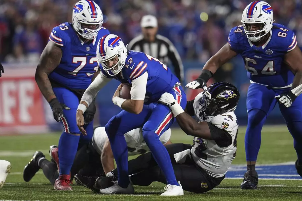Buffalo Bills quarterback Josh Allen (17) is tackled by Baltimore Ravens defensive tackle Nnamdi Madubuike (92) during the first half of an NFL football game in Orchard Park, N.Y., Sunday, Sept. 7, 2025. (AP Photo/Gene J. Puskar)
