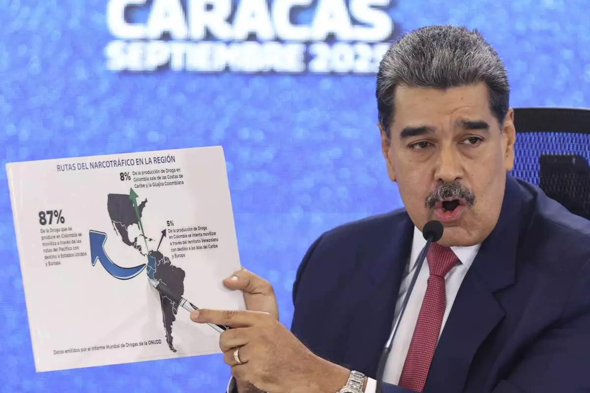 Venezuelan President Nicolas Maduro points at a map of the Americas during a press conference in Caracas, Venezuela, Monday, Sept 15, 2025. (AP Photo/Jesus Vargas)