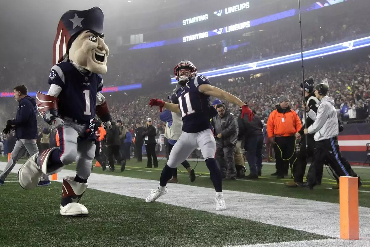 FILE - New England Patriots mascot Pat Patriot, left, and wide receiver Julian Edelman charge onto the field for an NFL wild-card playoff football game against the Tennessee Titans, Saturday, Jan. 4, 2020, in Foxborough, Mass. (AP Photo/Elise Amendola, File)