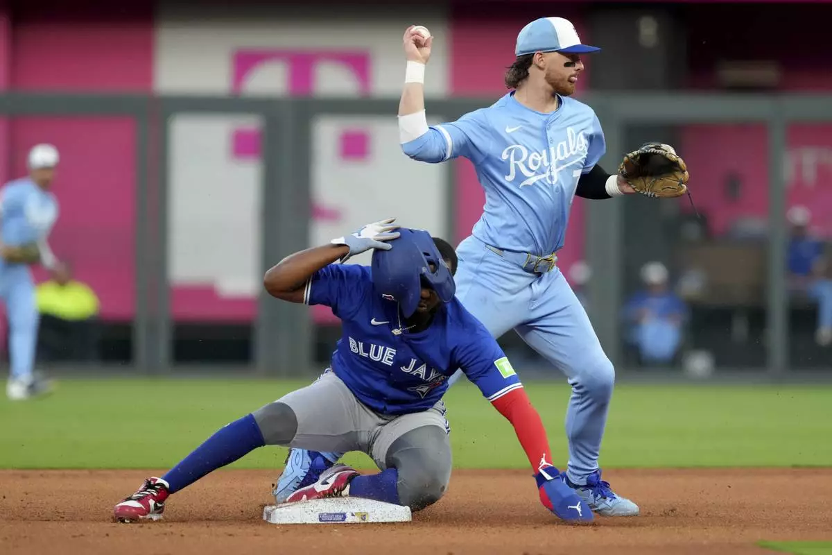 Kansas City Royals shortstop Bobby Witt Jr., top, throws to first base past Toronto Blue Jays' Vladimir Guerrero Jr., bottom, to complete a double play in the fourth inning during a baseball game Saturday Sept. 20, 2025, in Kansas City, Mo. (AP Photo/Ed Zurga)
