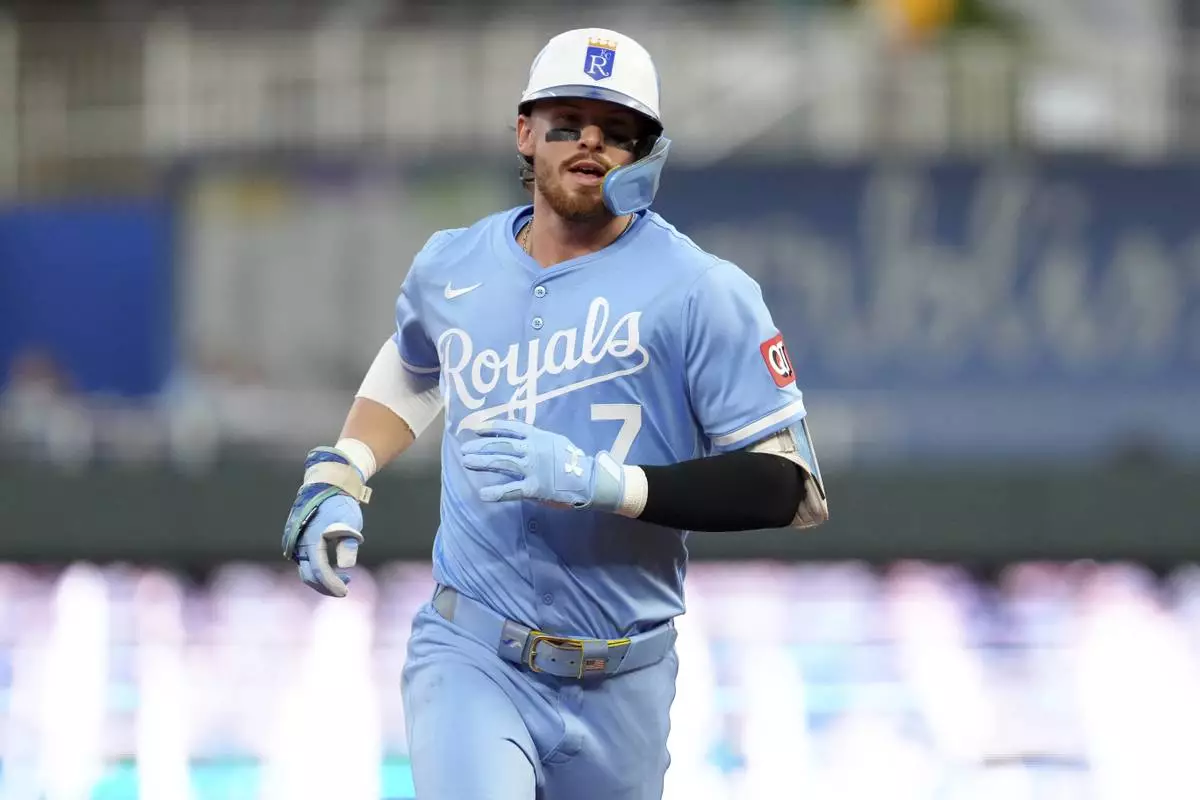 Kansas City Royals' Bobby Witt Jr. runs the bases after hitting a home run in the fourth inning against the Toronto Blue Jays during a baseball game Saturday Sept. 20, 2025, in Kansas City, Mo. (AP Photo/Ed Zurga)