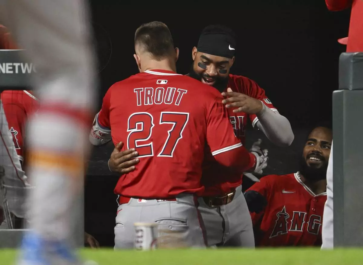 Los Angeles Angels designated hitter Mike Trout, left, is hugged by teammate Jo Adell after returning to the dugout following his home run in the eighth inning against the Colorado Rockies on Saturday, Sept. 20, 2025, in Denver. (AP Photo/RJ Sangosti)
