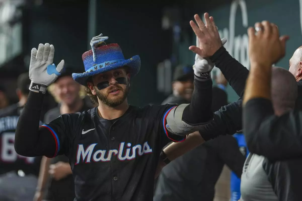 Miami Marlins' Connor Norby is greeted in the dugout after hitting a solo home run off Texas Rangers pitcher Jack Leiter during the sixth inning of a baseball game Saturday, Sept. 20, 2025, in Arlington, Texas. (AP Photo/Julio Cortez)