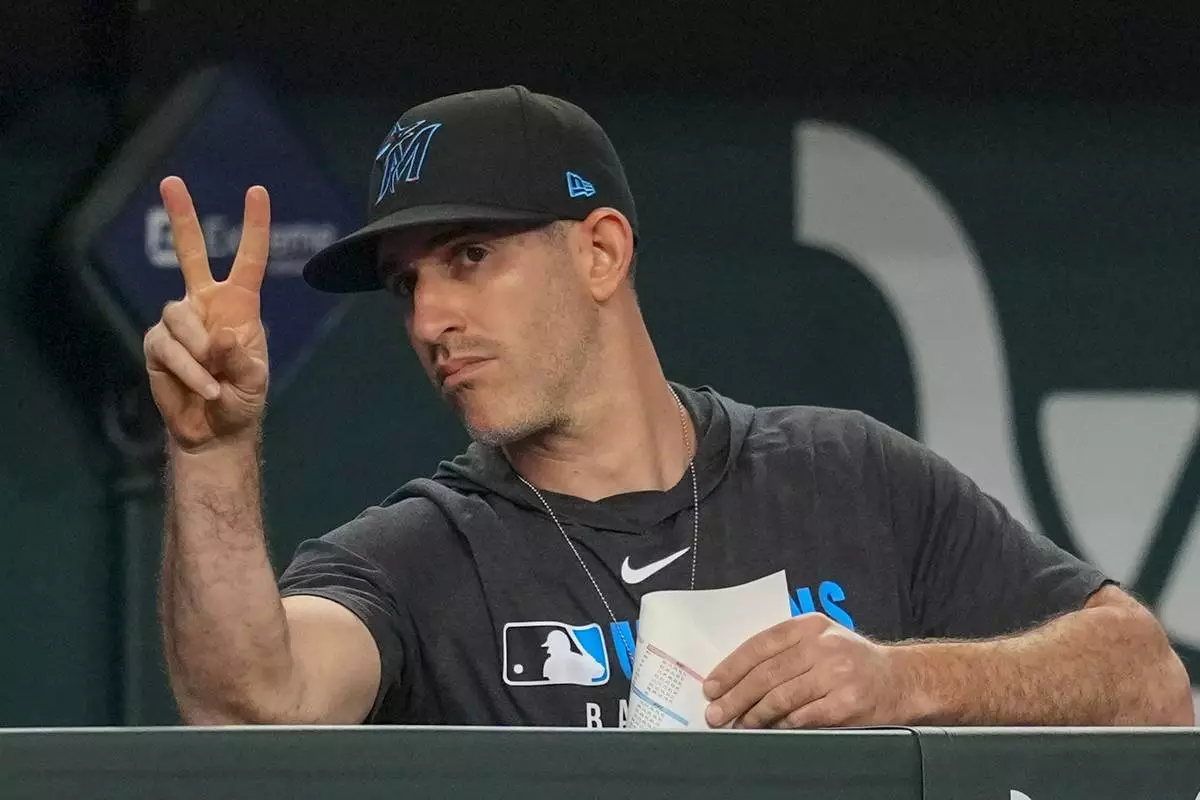 Miami Marlins assistant pitching coach & assistant pitching director Alon Leichman gestures signs toward catcher Agustín Ramírez during the eighth inning of a baseball game Saturday, Sept. 20, 2025, in Arlington, Texas. (AP Photo/Julio Cortez)