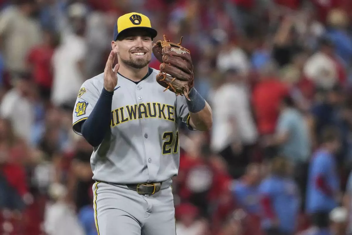 Milwaukee Brewers third baseman Caleb Durbin celebrates a victory over the St. Louis Cardinals following a baseball game Saturday, Sept. 20, 2025, in St. Louis. (AP Photo/Jeff Roberson)