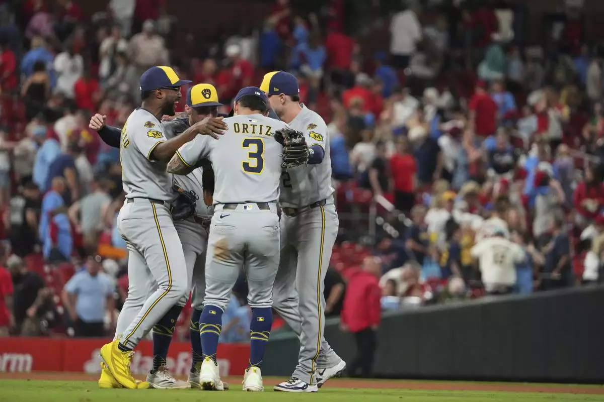 Members of the Milwaukee Brewers celebrate a victory over the St. Louis Cardinals following a baseball game Saturday, Sept. 20, 2025, in St. Louis. (AP Photo/Jeff Roberson)