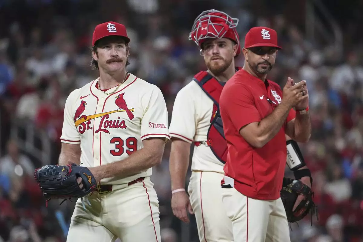 St. Louis Cardinals' Miles Mikolas (39) is removed by manager Oliver Marmol, right, as catcher Pedro Pages watches during the sixth inning of a baseball game against the Milwaukee Brewers Saturday, Sept. 20, 2025, in St. Louis. (AP Photo/Jeff Roberson)