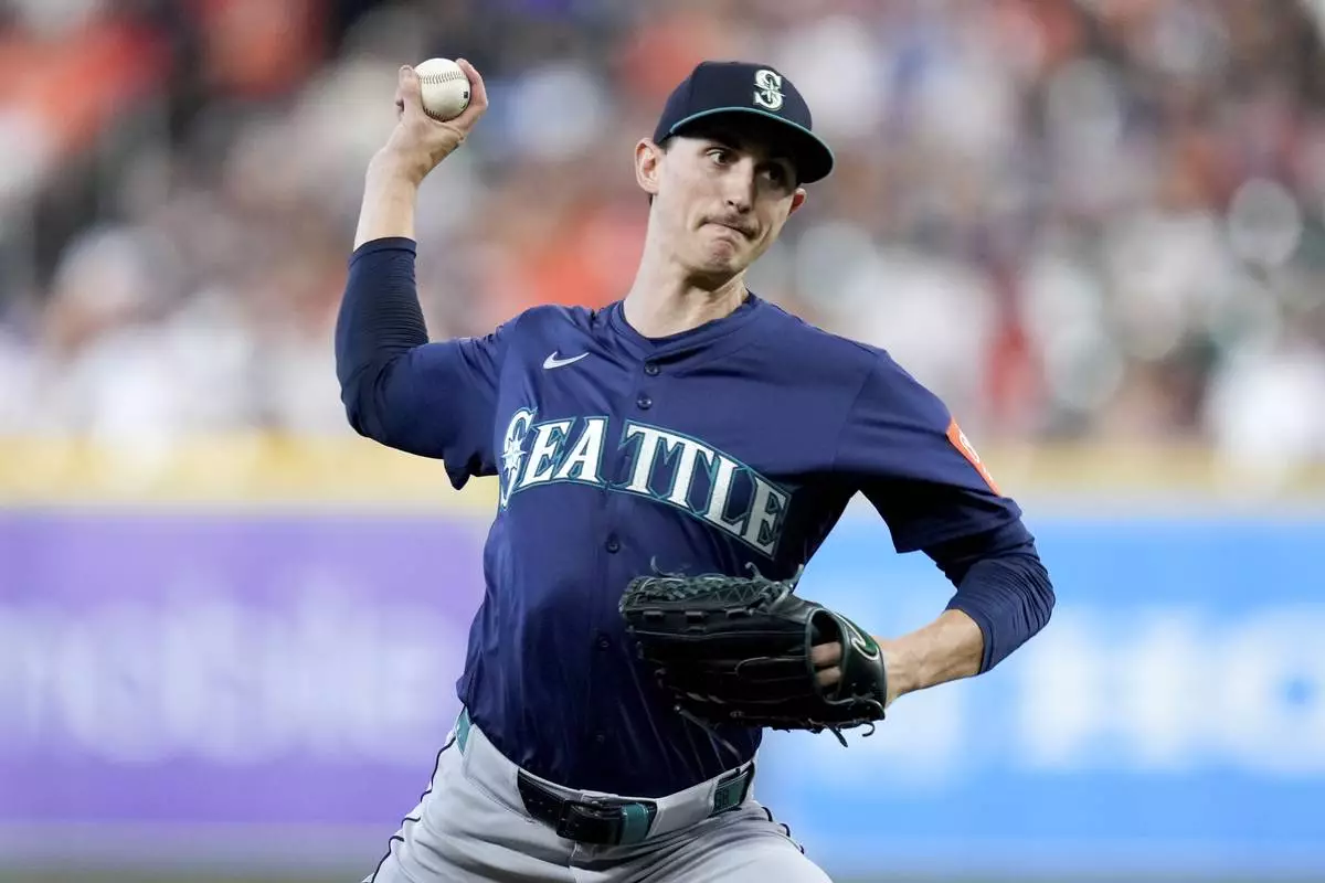 Seattle Mariners starting pitcher George Kirby throws a pitch against the Houston Astros during the first inning of a baseball game Saturday, Sept. 20, 2025, in Houston. (AP Photo/Eric Christian Smith)