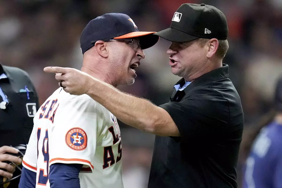 After being ejected from the game, Houston Astros manager Joe Espada, left, argues with third base umpire Mike Muchlinski during the sixth inning of a baseball game against the Seattle Mariners, Saturday, Sept. 20, 2025, in Houston. (AP Photo/Eric Christian Smith)
