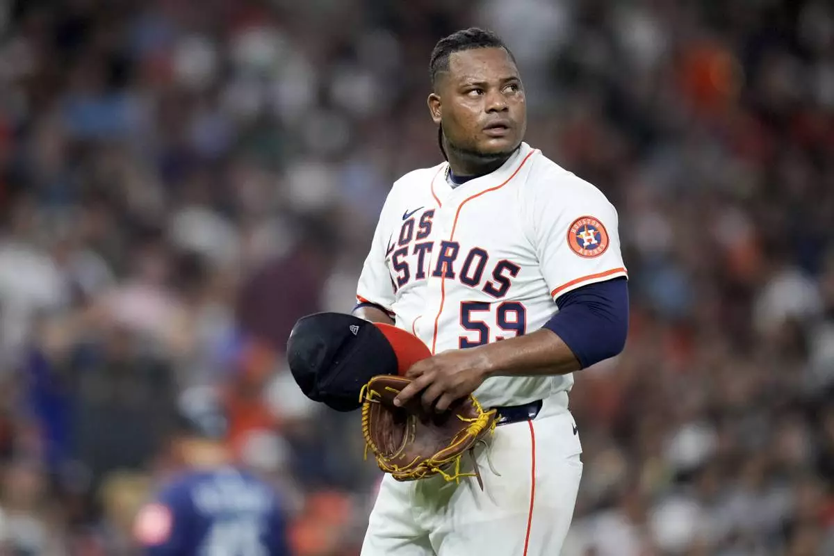 Houston Astros starting pitcher Framber Valdez (59) walks to the dugout after being pulled from the game during the fifth inning against the Seattle Mariners, Saturday, Sept. 20, 2025, in Houston. (AP Photo/Eric Christian Smith)