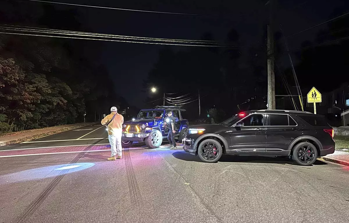 Police block a road to a country club where a shooting happened at Sky Meadow Country Club in Nashua, New Hampshire, Saturday, Sept. 20, 2025. (AP Photo/Michael Casey)