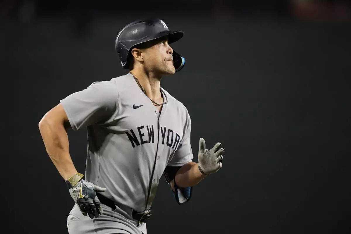 New York Yankees' Giancarlo Stanton rounds the bases after hitting a three-run home run during the first inning of a baseball game against the Baltimore Orioles, Saturday, Sept. 20, 2025, in Baltimore. (AP Photo/Stephanie Scarbrough)