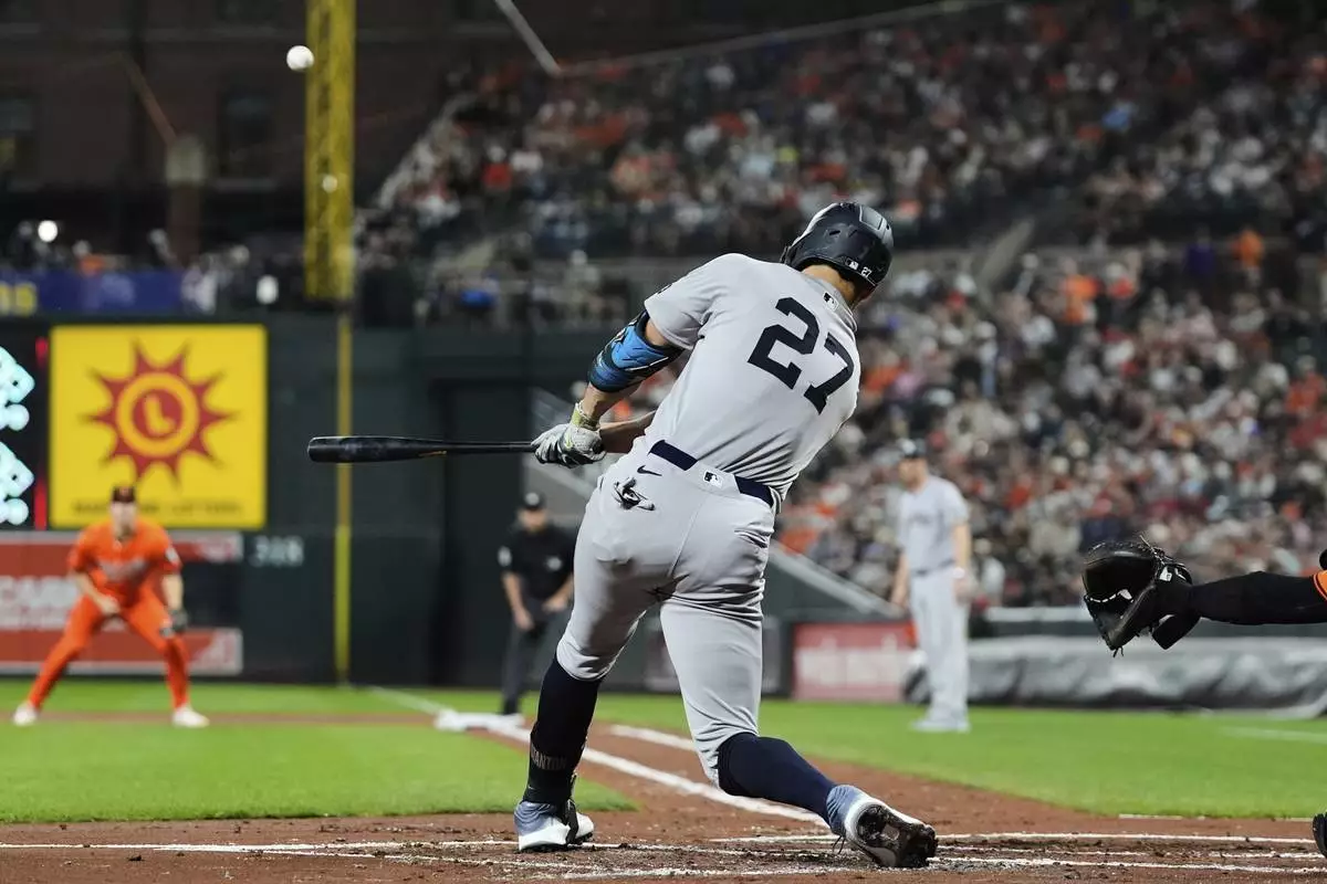 New York Yankees' Giancarlo Stanton hits a three-run home run during the first inning of a baseball game against the Baltimore Orioles, Saturday, Sept. 20, 2025, in Baltimore. (AP Photo/Stephanie Scarbrough)