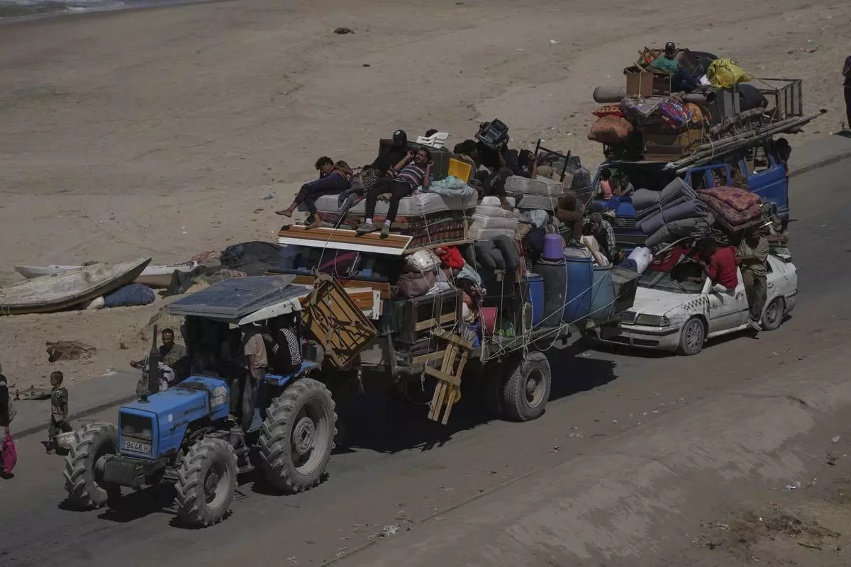 Displaced Palestinians flee northern Gaza Strip, by foot and in vehicles, carrying their belongings along the coastal road, near Wadi Gaza, Saturday, Sept. 20, 2025. (AP Photo/Abdel Kareem Hana)