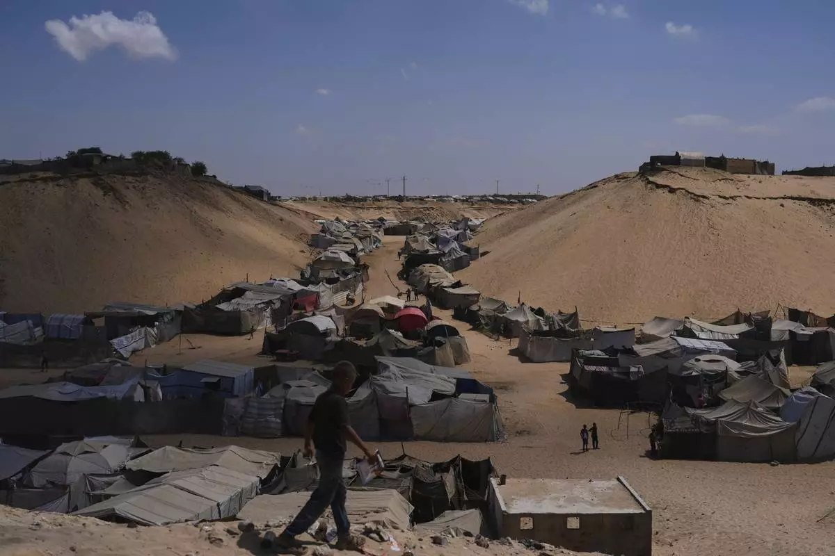 Displaced Palestinians walks through a tent camp in Muwasi, an area that Israel has designated as a safe zone, in Khan Younis southern Gaza Strip, Sunday, Sept. 21, 2025. (AP Photo/Jehad Alshrafi)