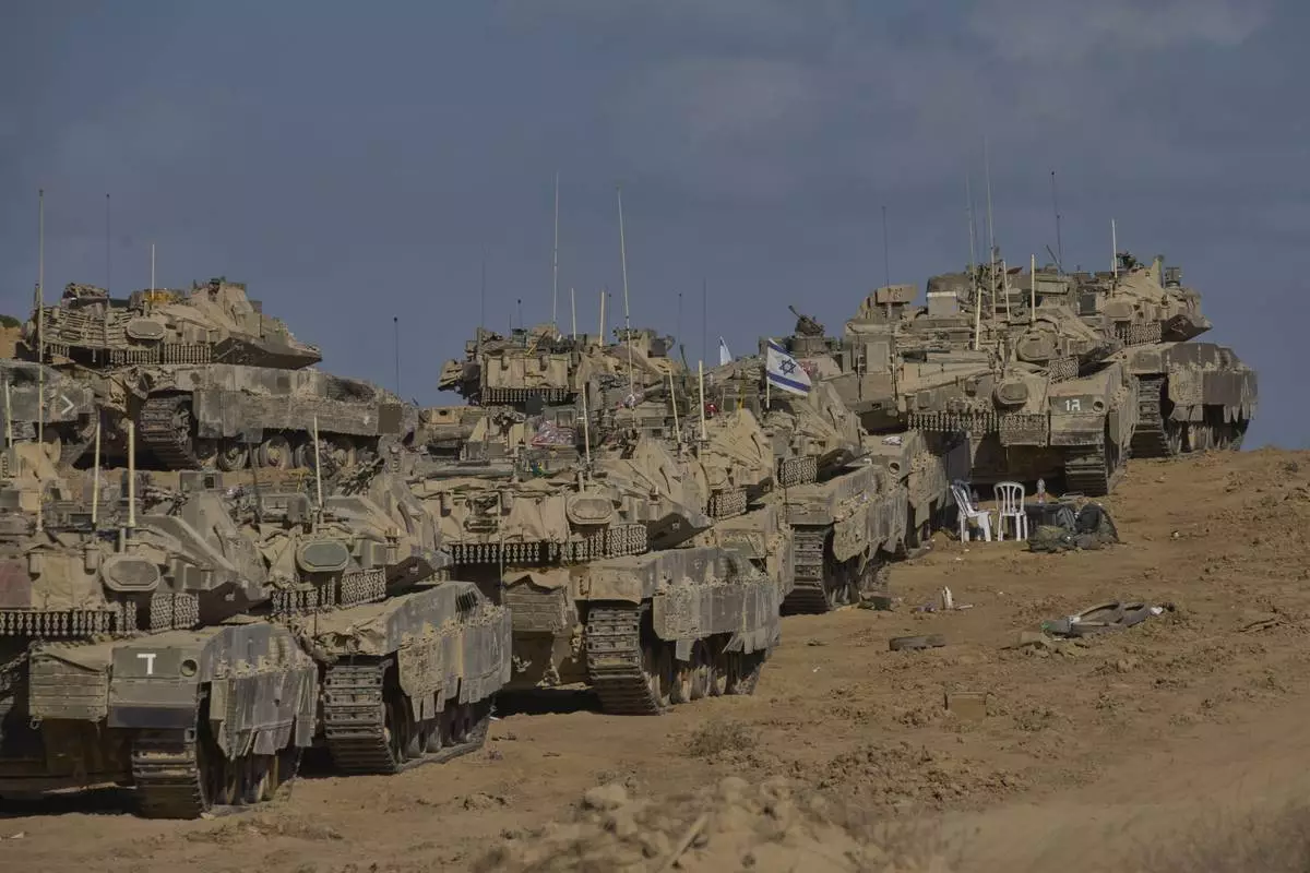 Israeli tanks at a staging area near the border with the Gaza Strip, in southern Israel, Sunday, Sept. 21, 2025. (AP Photo/Ohad Zwigenberg)