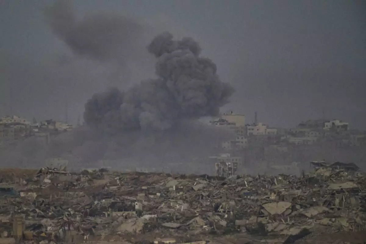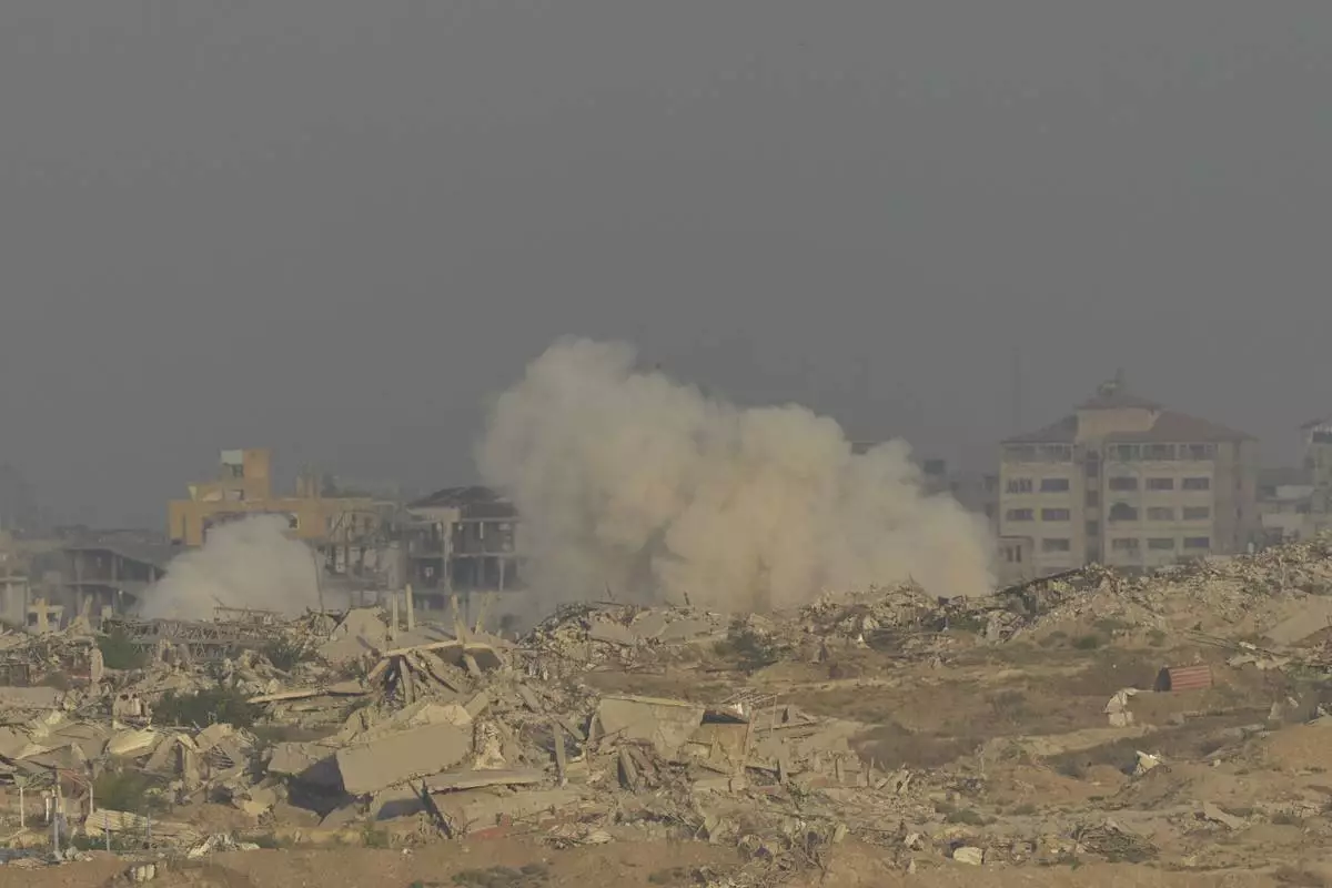 Smoke rises following an explosion in the Gaza Strip, as seen from southern Israel, Sunday, Sept. 21, 2025. (AP Photo/Ohad Zwigenberg)