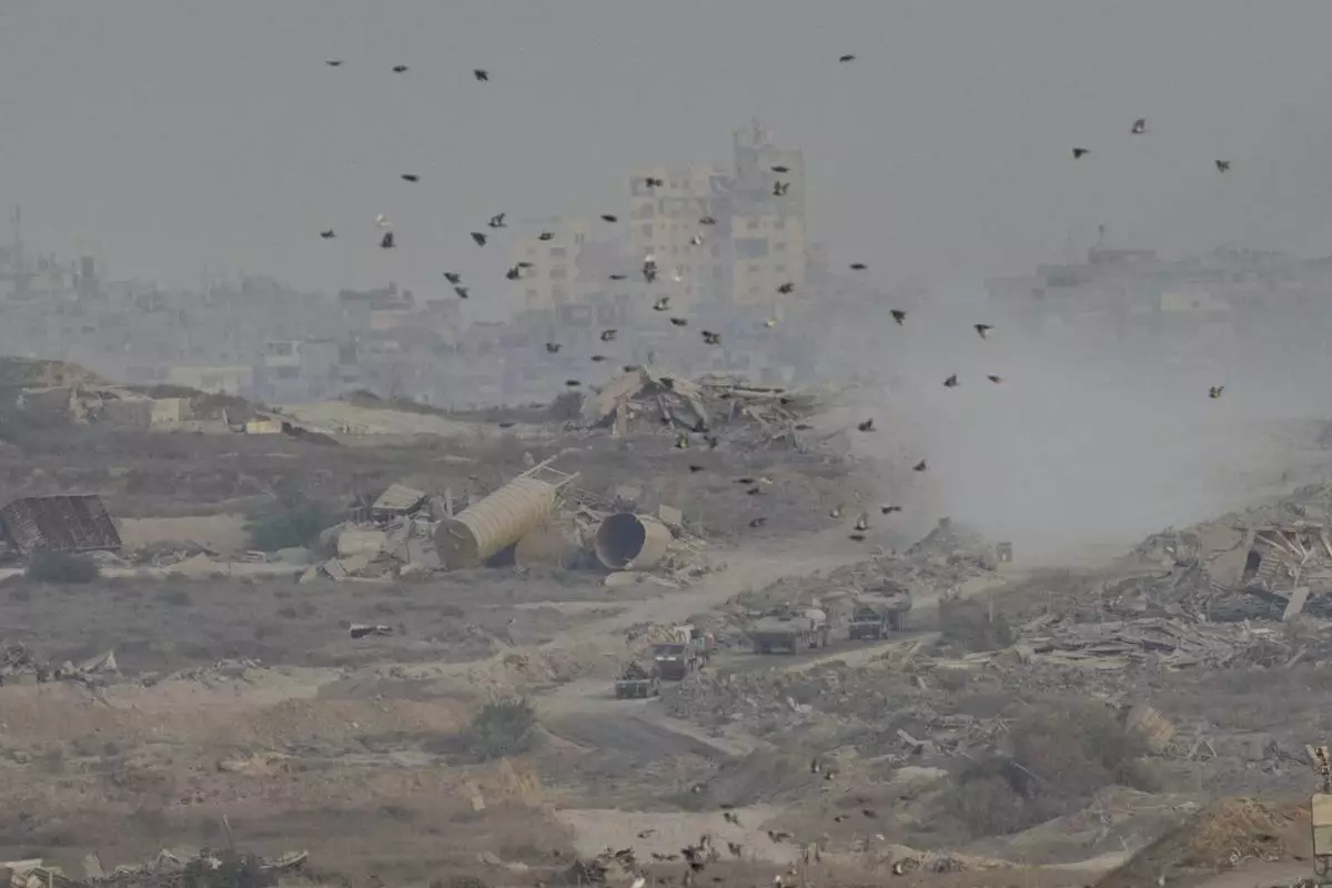 Israeli soldiers drive on their armored personnel carrier inside the northern Gaza Strip, as seen from southern Israel, Sunday, Sept. 21, 2025. (AP Photo/Ohad Zwigenberg)