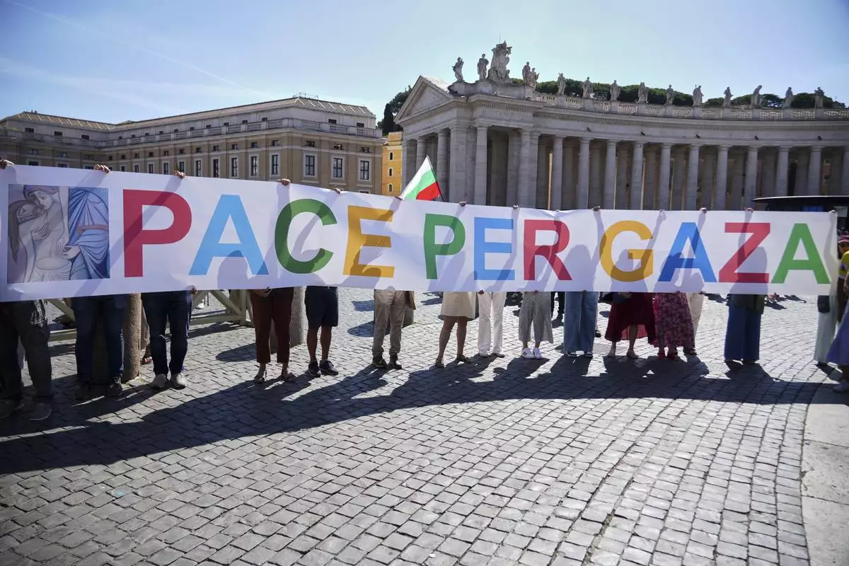 People hold a banner reading "Peace for Gaza' as Pope Leo XIV recites the Angelus noon prayer from the window of his studio overlooking St.Peter's Square, at the Vatican, Sunday, Sept. 21, 2025. (AP Photo/Andrew Medichini)