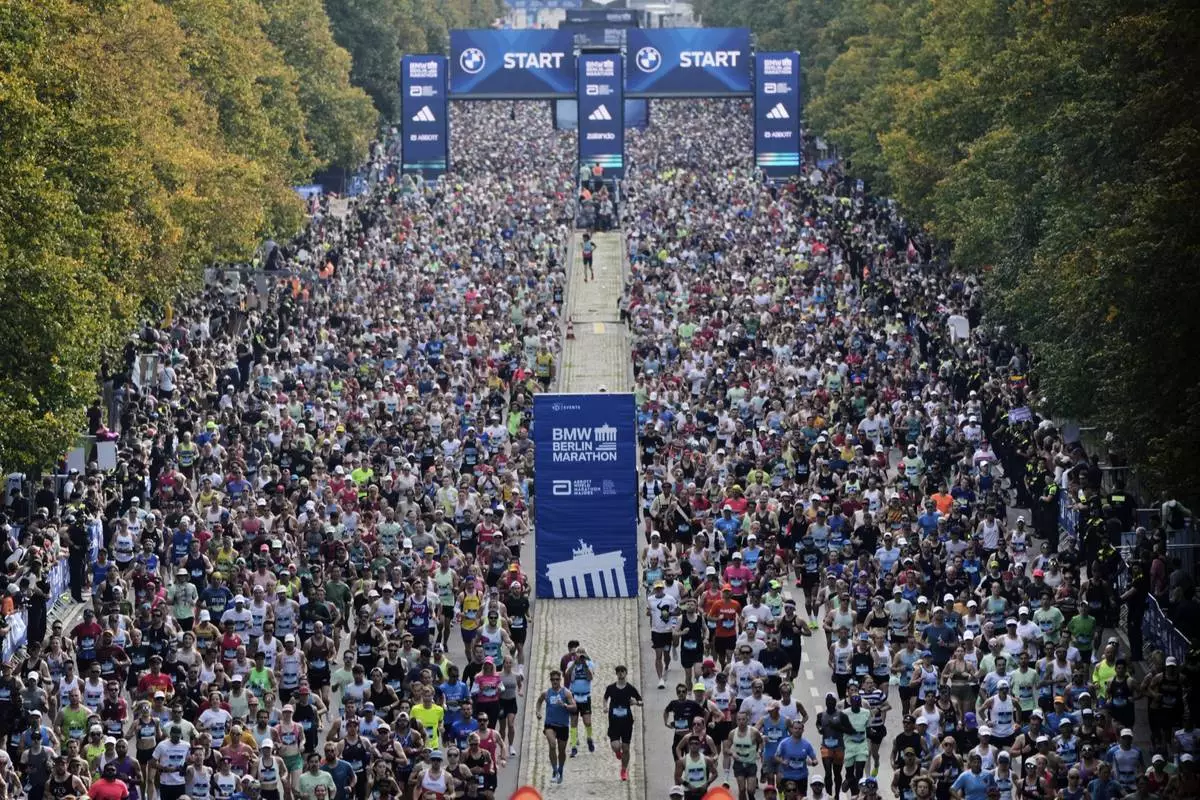 Competitors start in the Berlin Marathon in Berlin, Germany, Sunday, Sept.21, 2025. (AP Photo/Markus Schreiber)