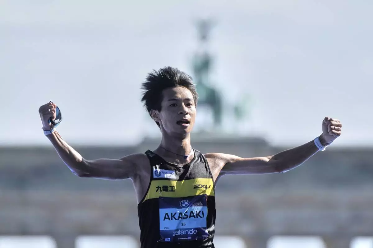 Japan's Akira Akasaki crosses the finish line to finish second in the Berlin Marathon in Berlin, Germany, Sunday, Sept.21, 2025. (AP Photo/Markus Schreiber)