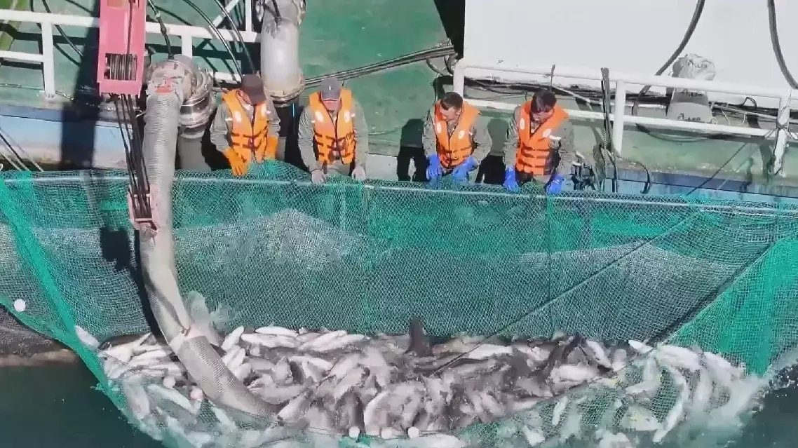 "The water in Nilka County comes from melted snow from over 100 river valleys of the Tianshan Mountains. That's why our fish are high quality in texture and appearance. Our salmon farming is fully automated. With a single button, we control feeding schedules and amounts down to the minute. We have three water quality monitoring platforms and underwater cleaning robots. If any issues are detected, we conduct on-site inspections immediately," said Baghdaulet.