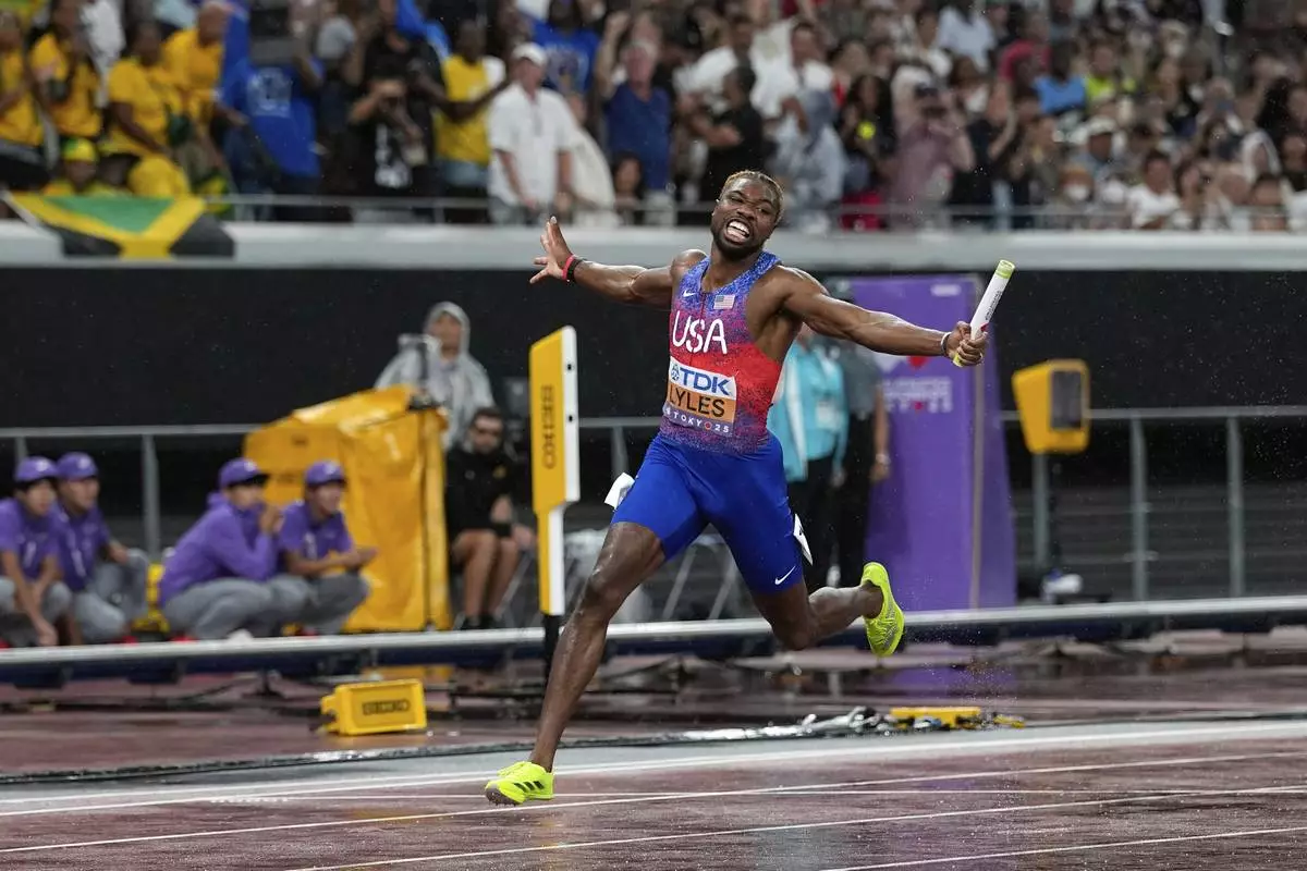 United States' Noah Lyles crosses the finish line to win the men's 4 X 100 meters relay at the World Athletics Championships in Tokyo, Sunday, Sept. 21, 2025. (AP Photo/Matthias Schrader)