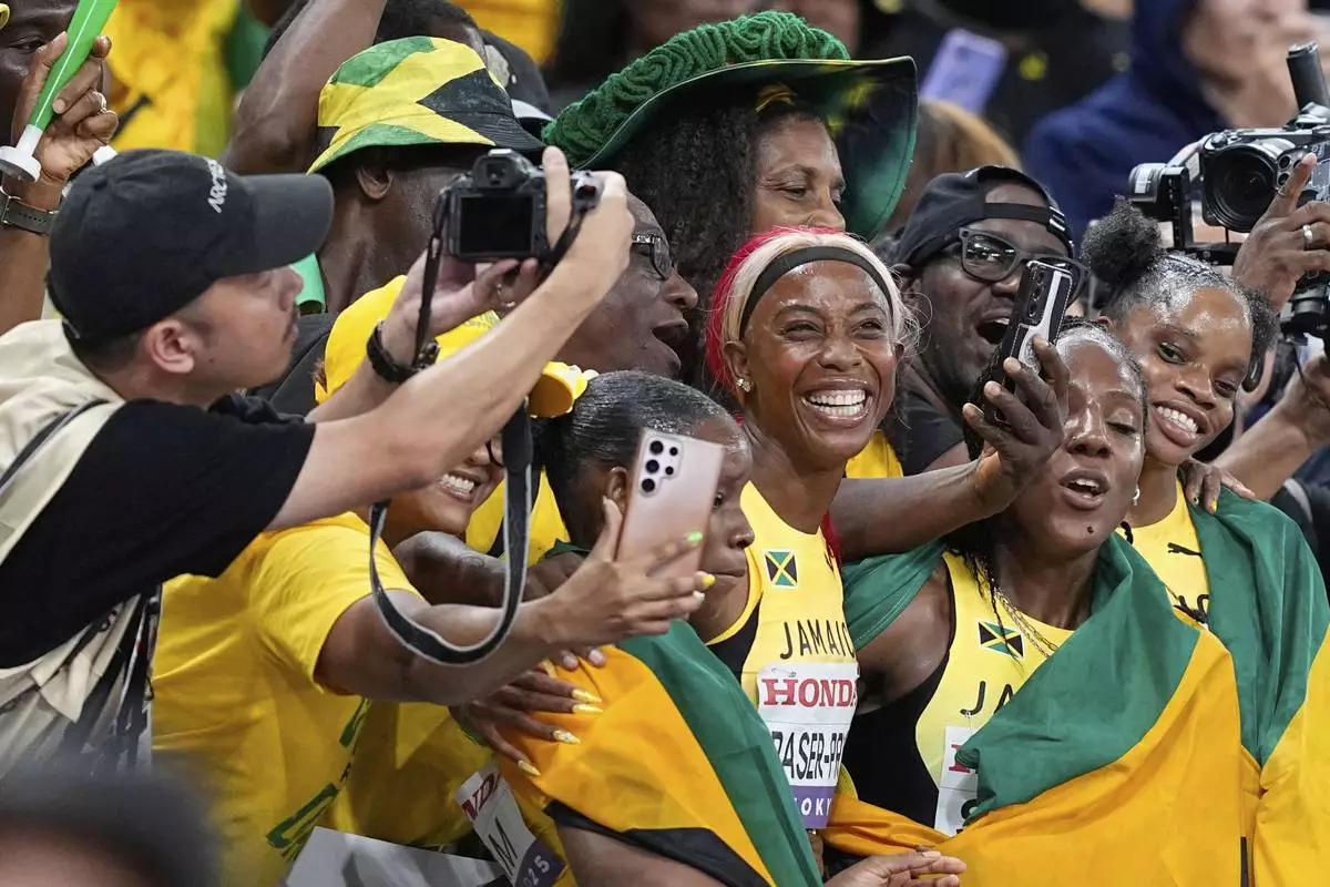 Jamaica's Shelly-Ann Fraser-Pryce and her teammates celebrate with supporters after taking the silver in the women's 4 X 100 meters relay final at the World Athletics Championships in Tokyo, Sunday, Sept. 21, 2025. (AP Photo/Petr David Josek)