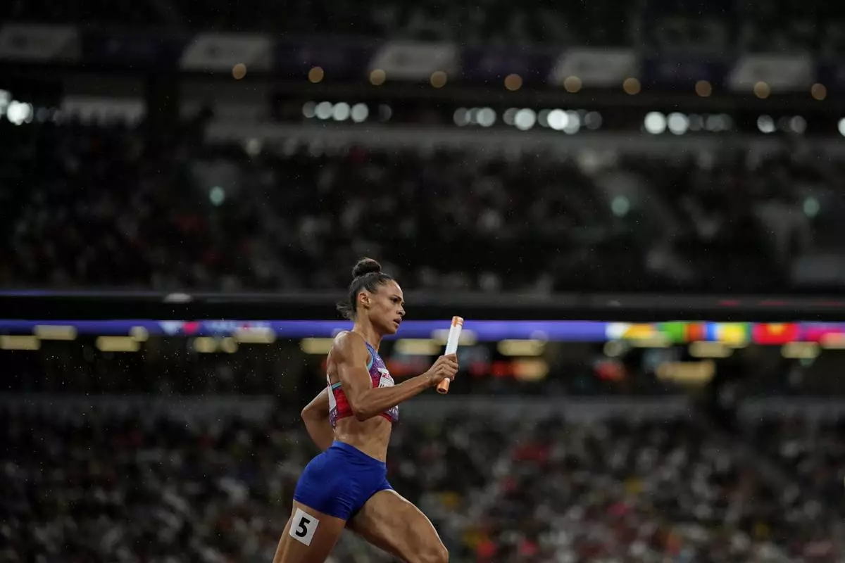United States' Sydney McLaughlin-Levrone competes in the women's 4 X 400 meters relay at the World Athletics Championships in Tokyo, Sunday, Sept. 21, 2025. (AP Photo/Ashley Landis)