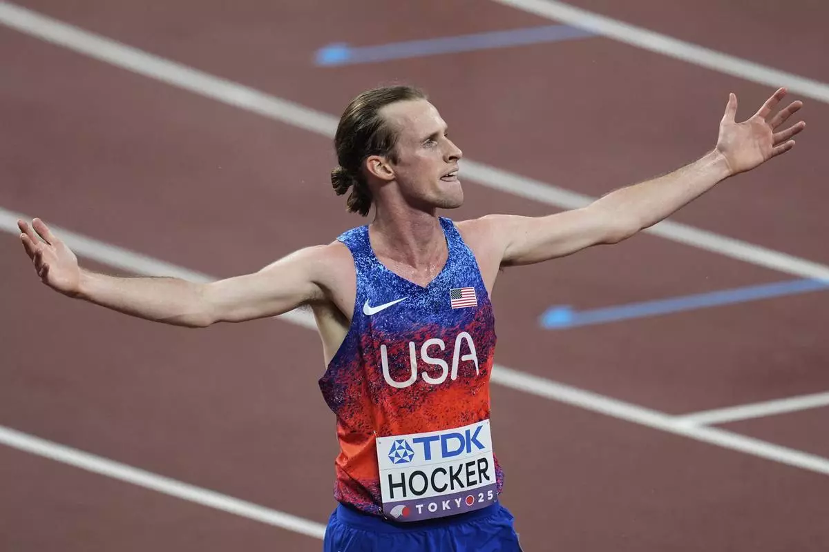 United States' Cole Hocker reacts after winning the gold medal in the men's 5,000 meters final at the World Athletics Championships in Tokyo, Sunday, Sept. 21, 2025. (AP Photo/Abbie Parr)