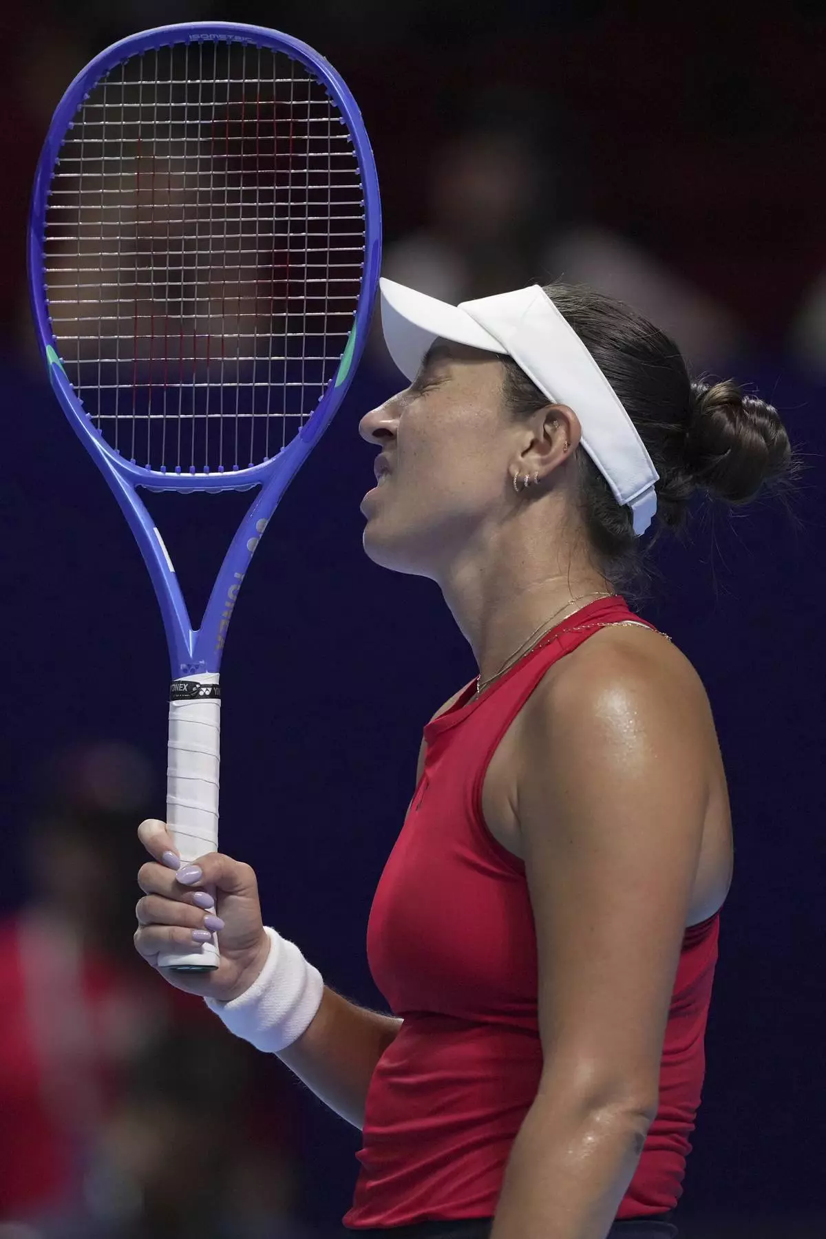 Jessica Pegula, of the United States reacts after losing a point to Jasmine Paolini, of Italy during the Billie Jean King Cup final tennis match, at the Shenzhen Bay Sports Center Arena, in Shenzhen, China's Guangdong province, Sunday, Sept. 21, 2025. (AP Photo/Andy Wong)